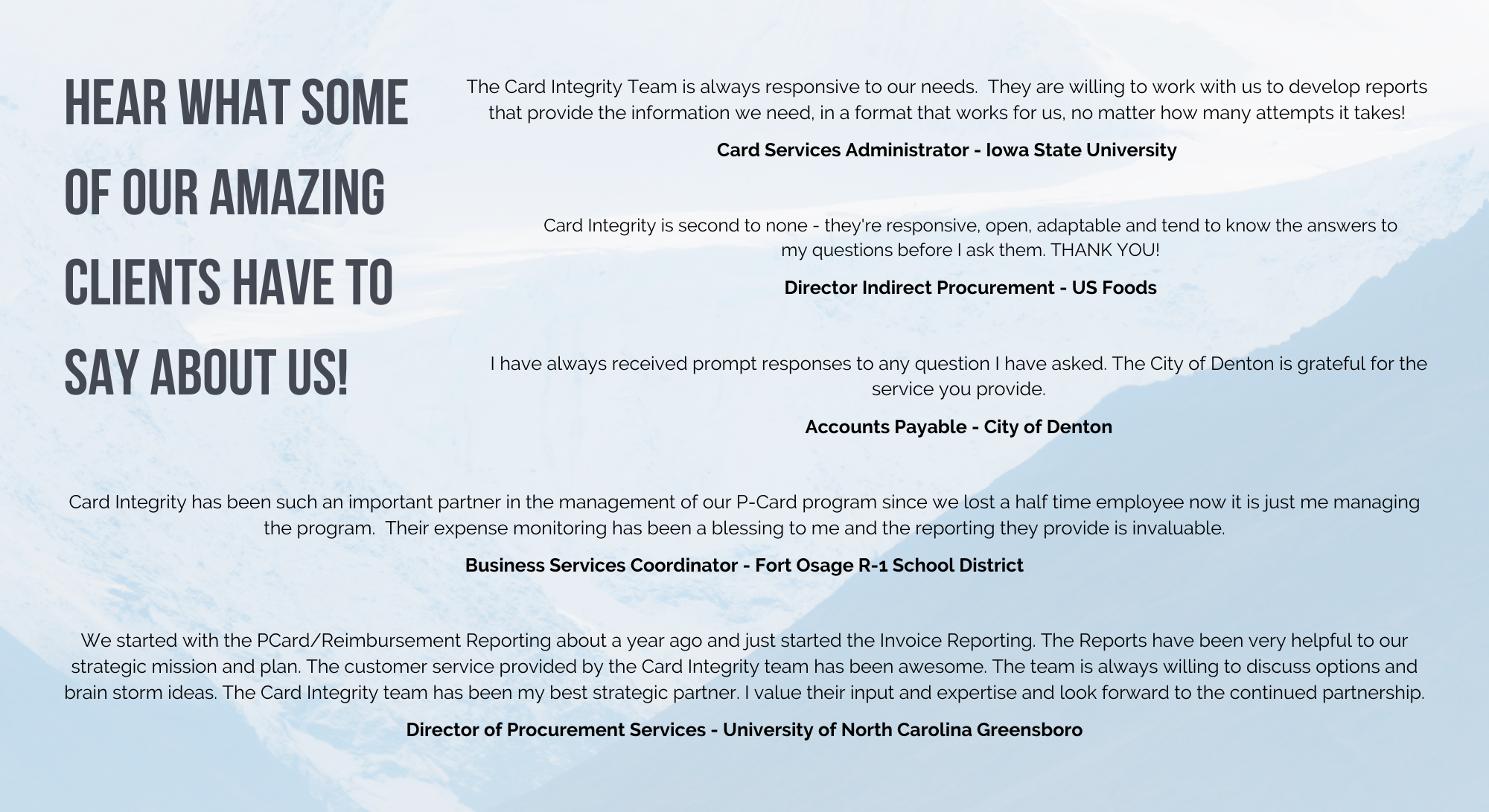Card Integrity helps organizations to spend wisely. To achieve this mission, we believe in exceeding client expectations by providing outstanding service. Most businesses interested in improving expense monitoring might expect a software-driven tool to be the first step toward finding results. Card Integrity likes to challenge this assumption with a more human approach to expense monitoring.