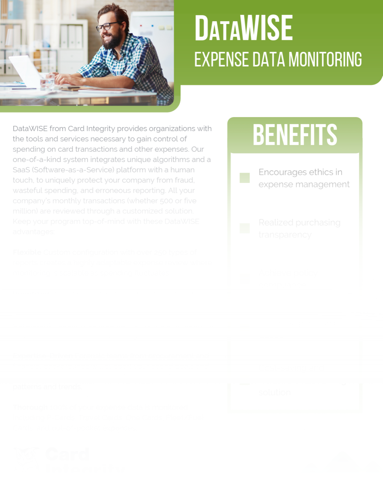 DataWISE from Card Integrity provides organizations with the tools and services necessary to gain control of spending on card transactions and other expenses. Our one-of-a-kind system integrates unique algorithms and a SaaS (Software-as-a-Service) platform with a human touch, to uniquely protect your company from fraud, wasteful spending, and erroneous reporting. All your company’s monthly transactions (whether 500 or five million) are reviewed through a customized solution.